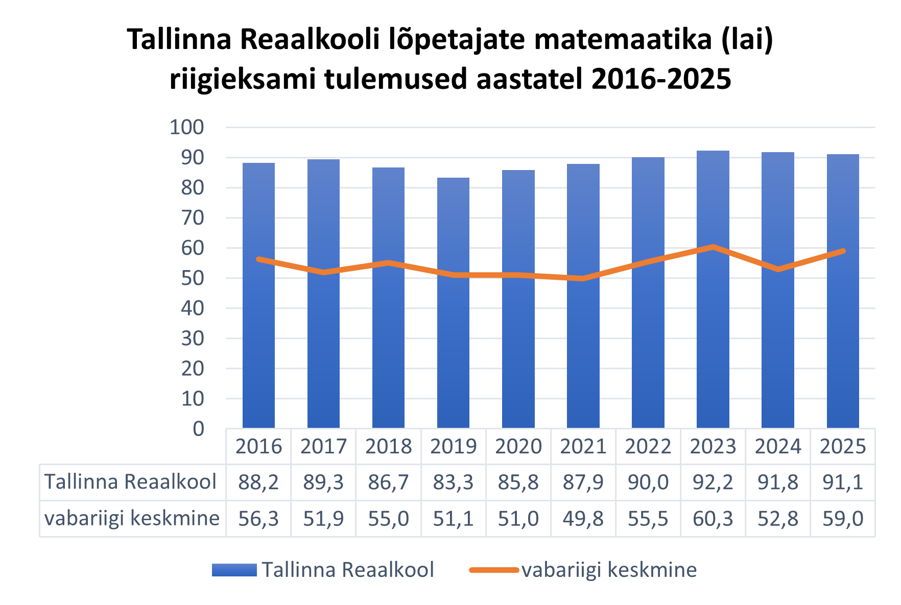Tallinna Reaalkoolis on alates riigieksamite sooritamise algusest 1997. aastal saavutatud 252 korral eksami tulemuseks 100 punkti. Maksimaalset tulemust on saavutatud kõige enam eesti keele (63 korral) ja matemaatika (164 korral) eksamil.